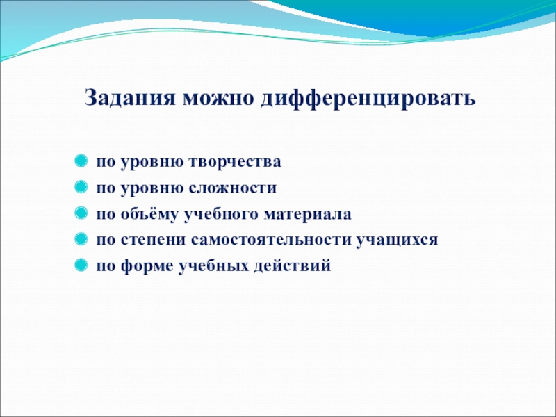 Задания можно дифференцироватьпо уровню творчествапо уровню сложностипо объёму учебного материалапо степени самостоятельности учащихсяпо форме учебных действий