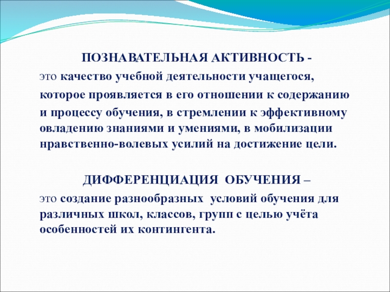 ПОЗНАВАТЕЛЬНАЯ АКТИВНОСТЬ -это качество учебной деятельности учащегося,которое проявляется в его отношении к содержаниюи процессу обучения, в стремлении