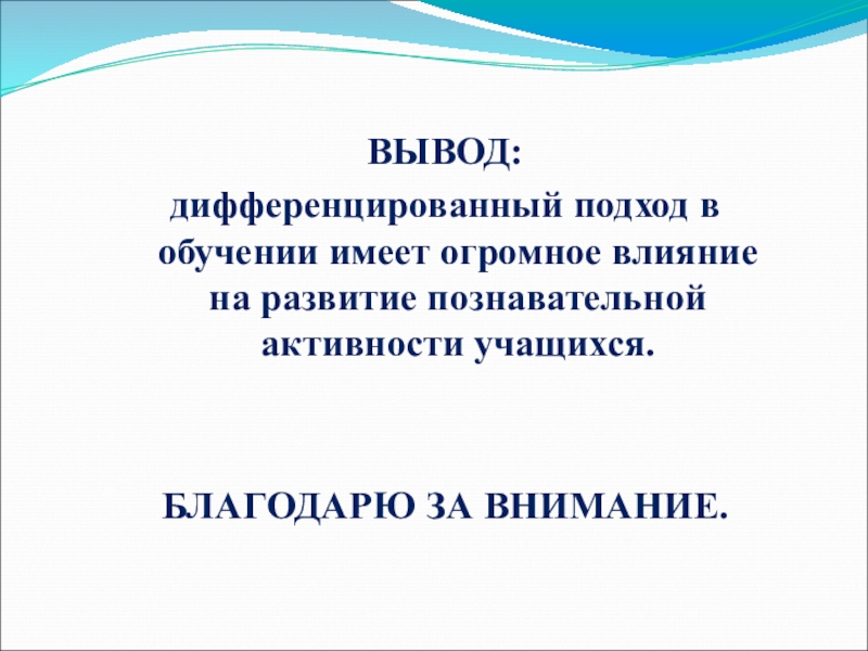 ВЫВОД:дифференцированный подход в обучении имеет огромное влияние на развитие познавательной активности учащихся.БЛАГОДАРЮ ЗА ВНИМАНИЕ.