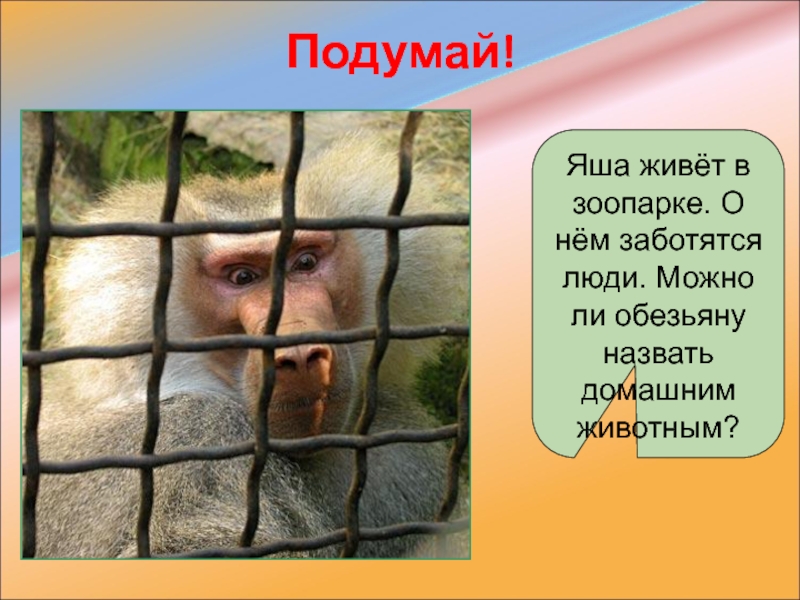 Подумай!Яша живёт в зоопарке. О нём заботятся люди. Можно ли обезьяну назвать домашним животным?