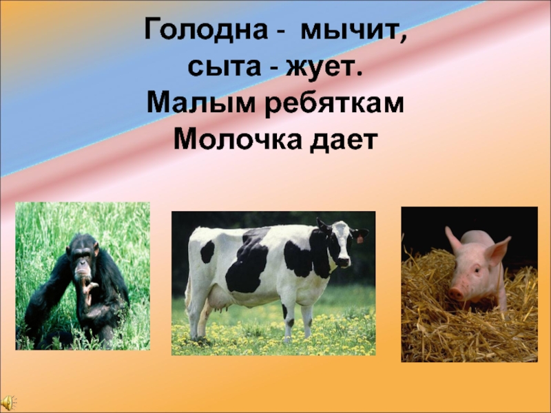 Слайд 8Голодна - мычит, сыта - жует. Малым ребяткам Молочка дает