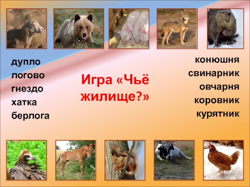 Игра «Чьё жилище?»дуплологовогнездохаткаберлогаконюшнясвинарниковчарнякоровниккурятник