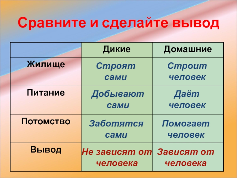 Сравните и сделайте выводСтроят самиЗаботятсясамиДаёт человекДобывают самиСтроит человекПомогает человекНе зависят отчеловекаЗависят отчеловека