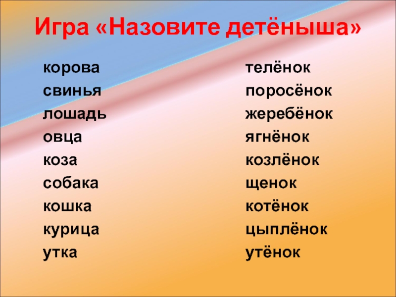 Игра «Назовите детёныша»коровасвиньялошадьовцакозасобакакошкакурицауткателёнокпоросёнокжеребёнокягнёноккозлёнокщеноккотёнокцыплёнокутёнок