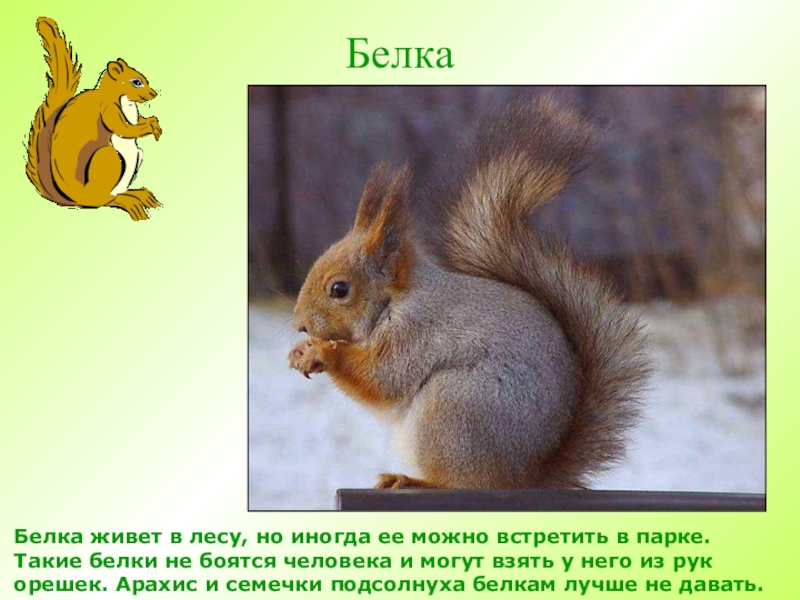 БелкаБелка живет в лесу, но иногда ее можно встретить в парке. Такие белки не боятся человека и