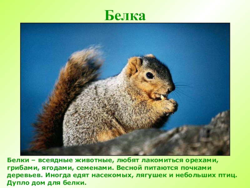 БелкаБелки – всеядные животные, любят лакомиться орехами, грибами, ягодами, семенами. Весной питаются почками деревьев. Иногда едят насекомых,