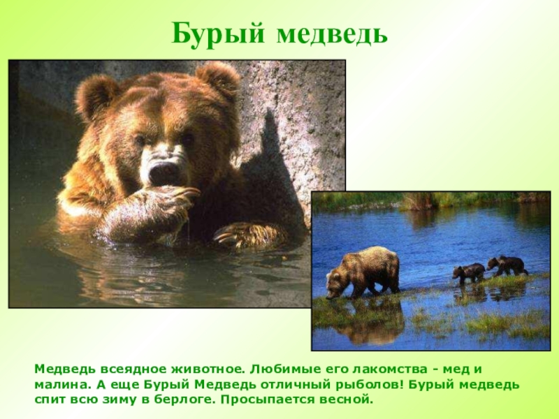 Бурый медведьМедведь всеядное животное. Любимые его лакомства - мед и малина. А еще Бурый Медведь отличный рыболов!