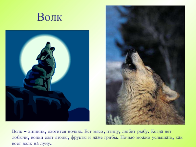 ВолкВолк – хищник, охотится ночью. Ест мясо, птицу, любит рыбу. Когда нет добычи, волки едят ягоды, фрукты