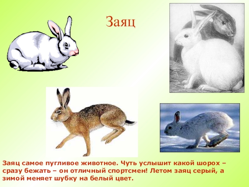 ЗаяцЗаяц самое пугливое животное. Чуть услышит какой шорох – сразу бежать – он отличный спортсмен! Летом заяц