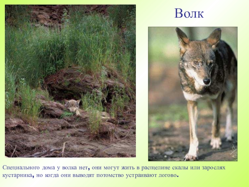 ВолкСпециального дома у волка нет, они могут жить в расщелине скалы или зарослях кустарника, но когда они