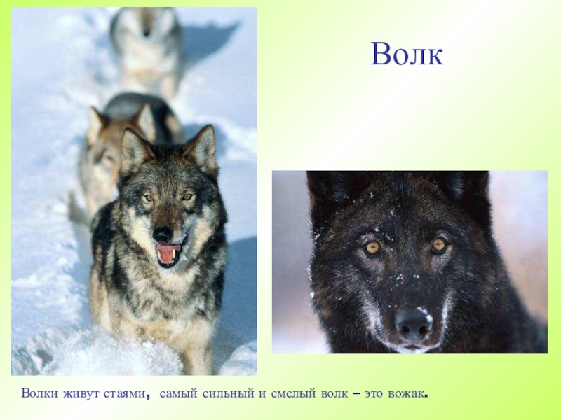 ВолкВолки живут стаями, самый сильный и смелый волк – это вожак.