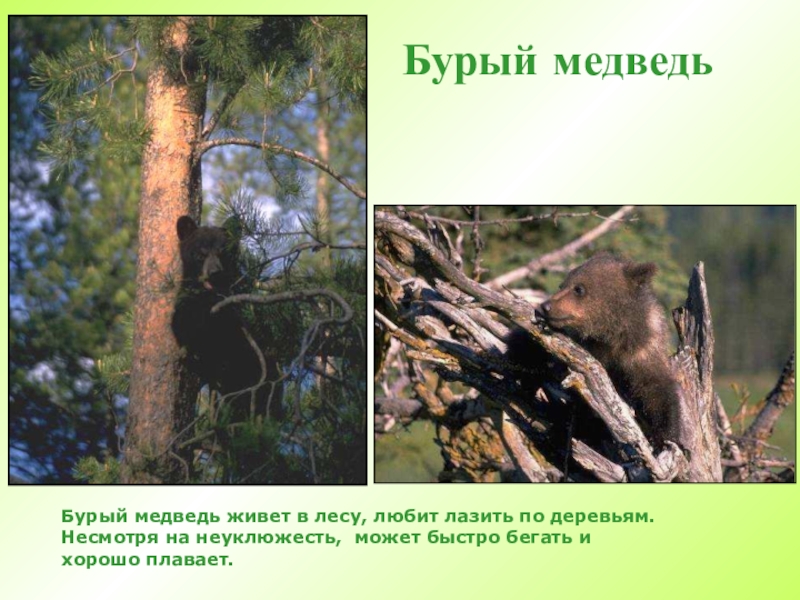 Бурый медведьБурый медведь живет в лесу, любит лазить по деревьям. Несмотря на неуклюжесть, может быстро бегать и хорошо плавает.