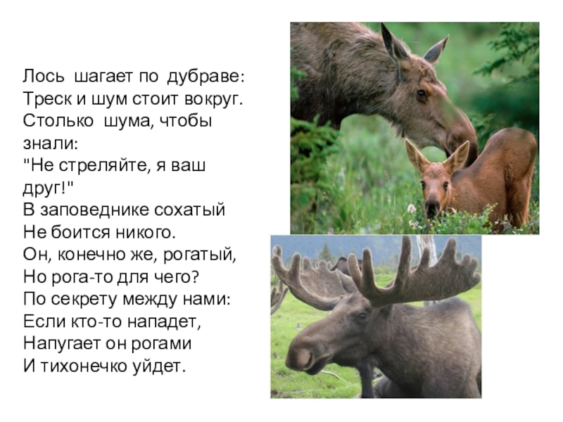 друг!" В заповеднике сохатый Не боится никого. Он, конечно же, рогатый, Но рога-то для чего? По секрету между нами: Если кто-то нападет, Напугает он рогами И тихонечко уйдет.