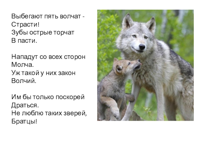 Слайд 4Выбегают пять волчат - Страсти! Зубы острые торчат В пасти. Нападут со всех сторон Молча. Уж такой