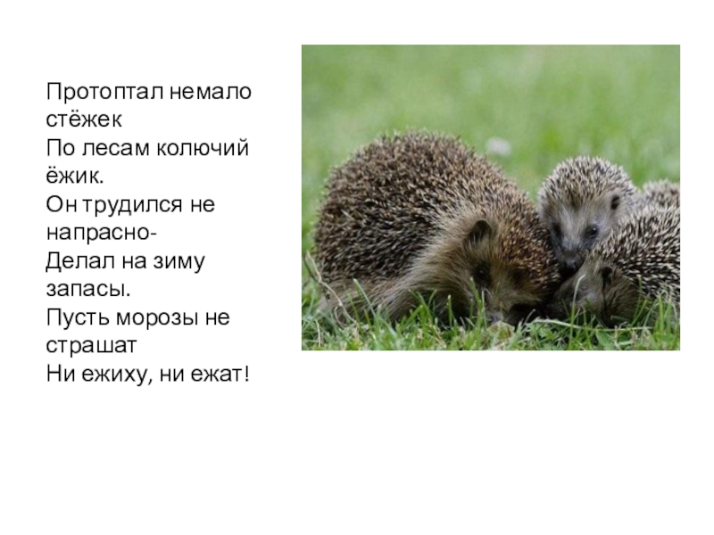 Протоптал немало стёжек По лесам колючий ёжик. Он трудился не напрасно- Делал на зиму запасы. Пусть морозы