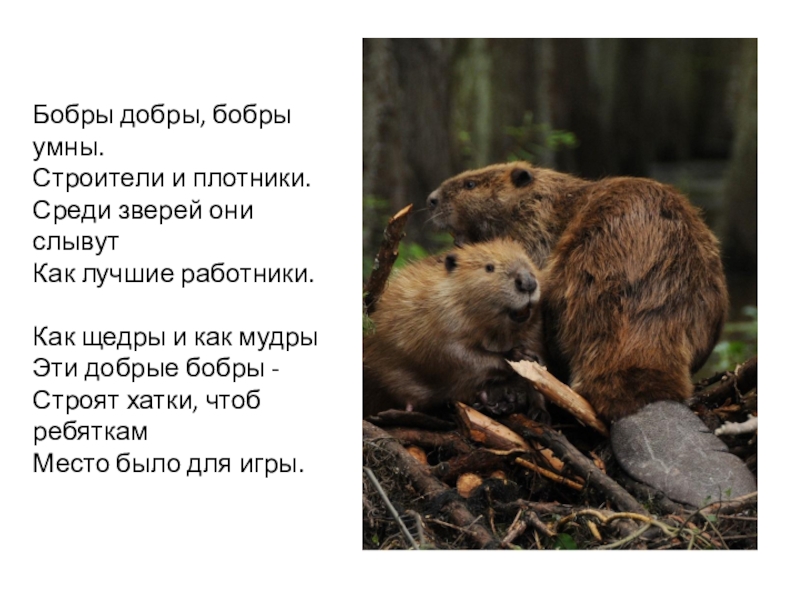 Бобры добры, бобры умны. Строители и плотники. Среди зверей они слывут Как лучшие работники.  Как щедры