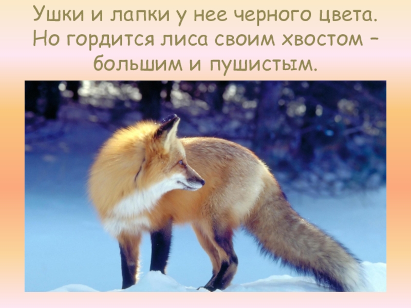 Слайд 5Ушки и лапки у нее черного цвета. Но гордится лиса своим