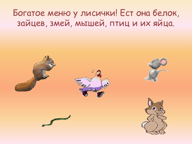 Слайд 7Богатое меню у лисички! Ест она белок, зайцев, змей, мышей, птиц