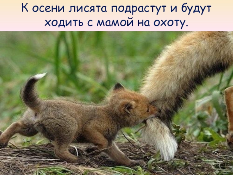 Слайд 12К осени лисята подрастут и будут ходить с мамой на охоту.