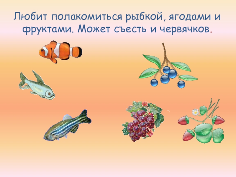 Слайд 8Любит полакомиться рыбкой, ягодами и фруктами. Может съесть и червячков.