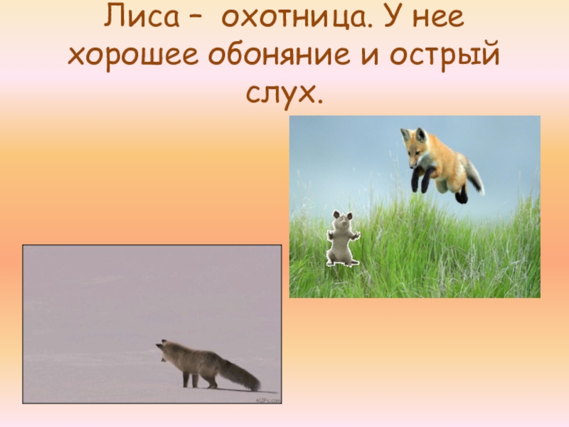 Слайд 9Лиса – охотница. У нее хорошее обоняние и острый слух.