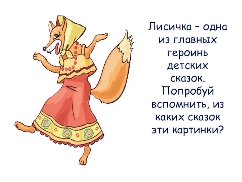Слайд 16Лисичка – одна из главных героинь детских сказок. Попробуй вспомнить, из
