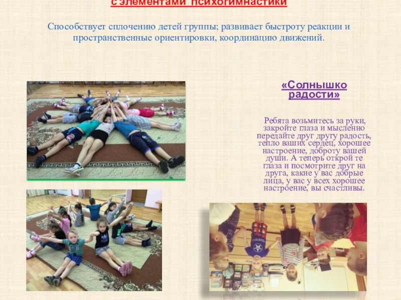 Ребята возьмитесь за руки, закройте глаза и мысленно передайте друг другу радость, тепло ваших сердец, хорошее настроение, доброту вашей души. А теперь открой те глаза и посмотрите друг на друга, какие у вас добрые лица, у вас у всех хорошее настроение, вы счастливы.