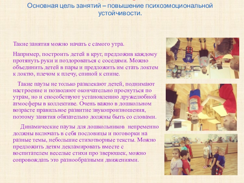 Такие паузы не только развлекают детей, поднимают настроение и позволяют окончательно проснуться по утрам, но и способствуют установлению дружелюбной атмосферы в коллективе. Очень важно в дошкольном возрасте правильное развитие звукопроизношения, поэтому занятия обязательно должны быть со словами.