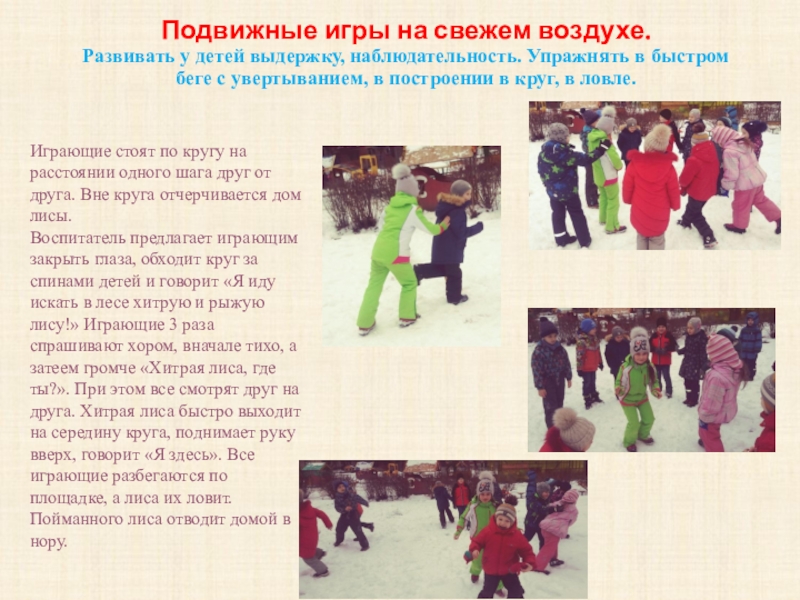 Воспитатель предлагает играющим закрыть глаза, обходит круг за спинами детей и говорит «Я иду искать в лесе хитрую и рыжую лису!» Играющие 3 раза спрашивают хором, вначале тихо, а затеем громче «Хитрая лиса, где ты?». При этом все смотрят друг на друга. Хитрая лиса быстро выходит на середину круга, поднимает руку вверх, говорит «Я здесь». Все играющие разбегаются по площадке, а лиса их ловит. Пойманного лиса отводит домой в нору.