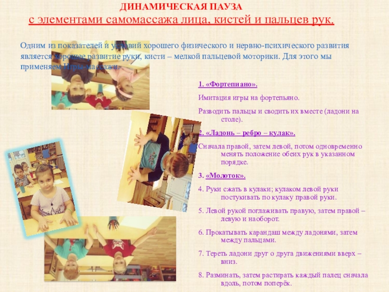 Одним из показателей и условий хорошего физического и нервно-психического развития является хорошее развитие руки, кисти – мелкой пальцевой моторики. Для этого мы применяем Игры-массажи.