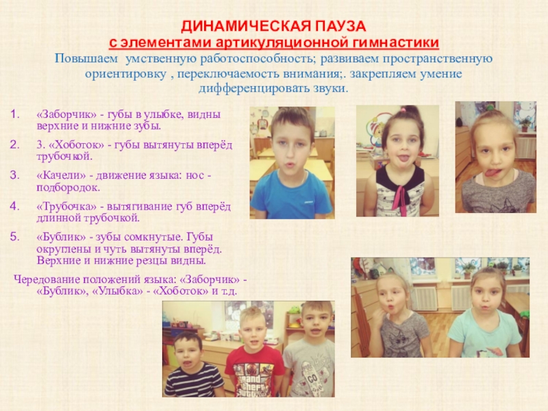 «Трубочка» - вытягивание губ вперёд длинной трубочкой.