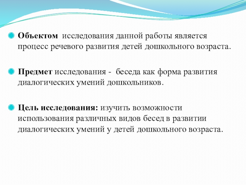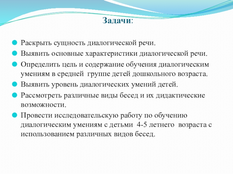 Провести исследовательскую работу по обучению диалогическим умениям с детьми 4-5 летнего возраста с использованием различных видов бесед.
