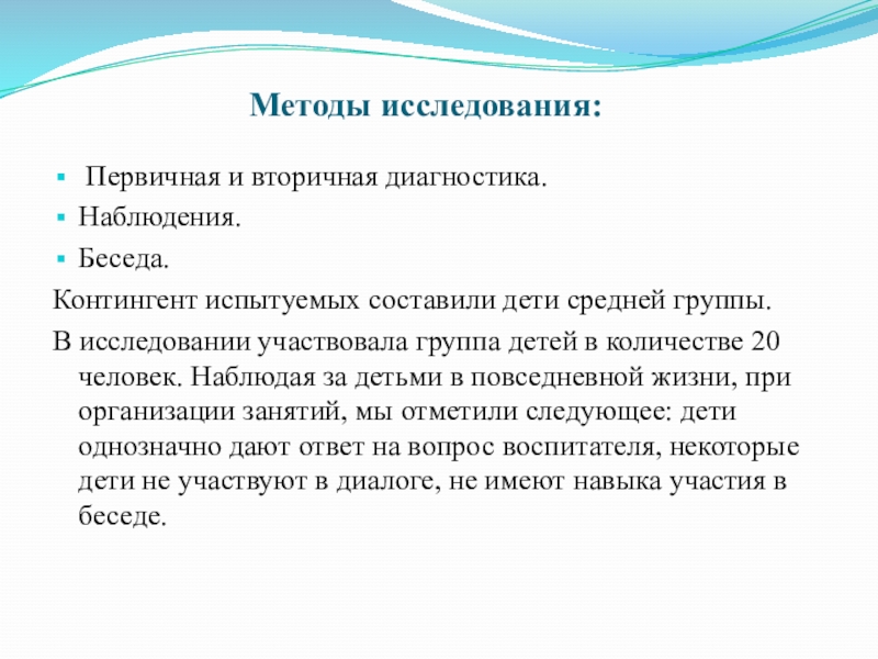 В исследовании участвовала группа детей в количестве 20 человек. Наблюдая за детьми в повседневной жизни, при организации занятий, мы отметили следующее: дети однозначно дают ответ на вопрос воспитателя, некоторые дети не участвуют в диалоге, не имеют навыка участия в беседе.