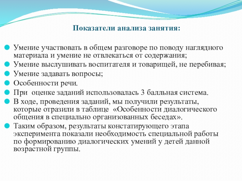 Таким образом, результаты констатирующего этапа эксперимента показали необходимость специальной работы по формированию диалогических умений у детей данной возрастной группы.