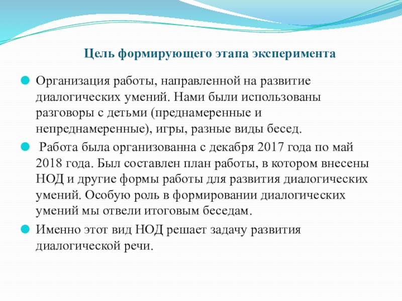 Работа была организованна с декабря 2017 года по май 2018 года. Был составлен план работы, в котором внесены НОД и другие формы работы для развития диалогических умений. Особую роль в формировании диалогических умений мы отвели итоговым беседам.