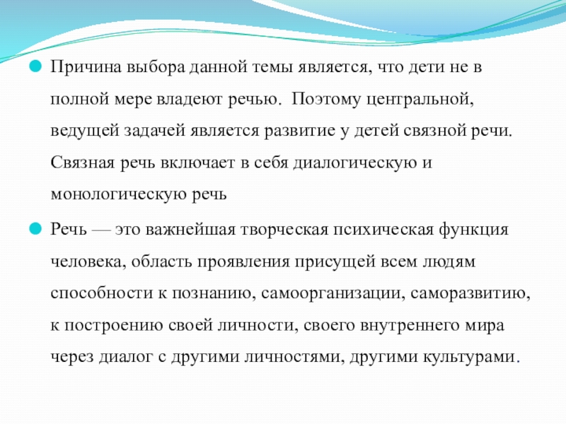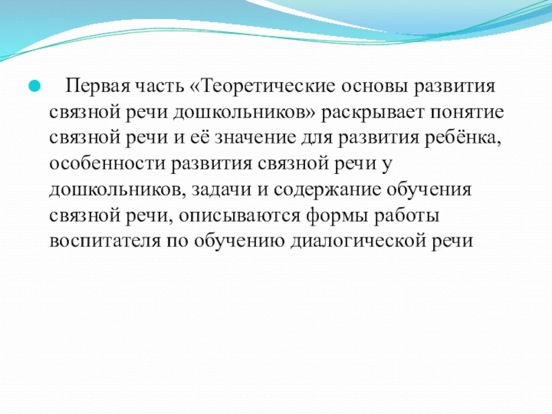 Первая часть «Теоретические основы развития связной речи дошкольников» раскрывает понятие связной речи и её значение для развития ребёнка, особенности развития связной речи у дошкольников, задачи и содержание обучения связной речи, описываются формы работы воспитателя по обучению диалогической речи