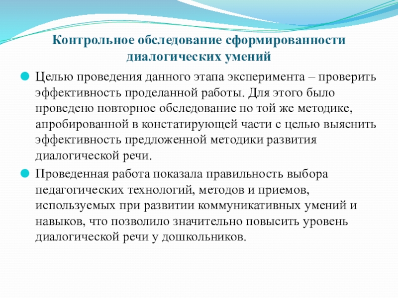 Целью проведения данного этапа эксперимента – проверить эффективность проделанной работы. Для этого было проведено повторное обследование по той же методике, апробированной в констатирующей части с целью выяснить эффективность предложенной методики развития диалогической речи.