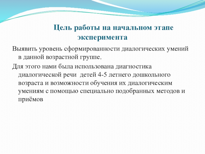 Для этого нами была использована диагностика диалогической речи детей 4-5 летнего дошкольного возраста и возможности обучения их диалогическим умениям с помощью специально подобранных методов и приёмов