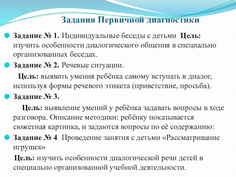 Задание № 1. Индивидуальные беседы с детьми Цель: изучить особенности диалогического общения в специально организованных беседах.