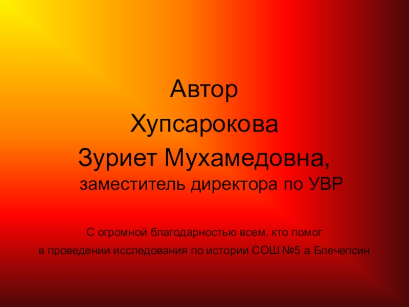Автор Хупсарокова Зуриет Мухамедовна, заместитель директора по УВРС огромной благодарностью всем, кто помог в проведении исследования по истории СОШ №5 а.Блечепсин