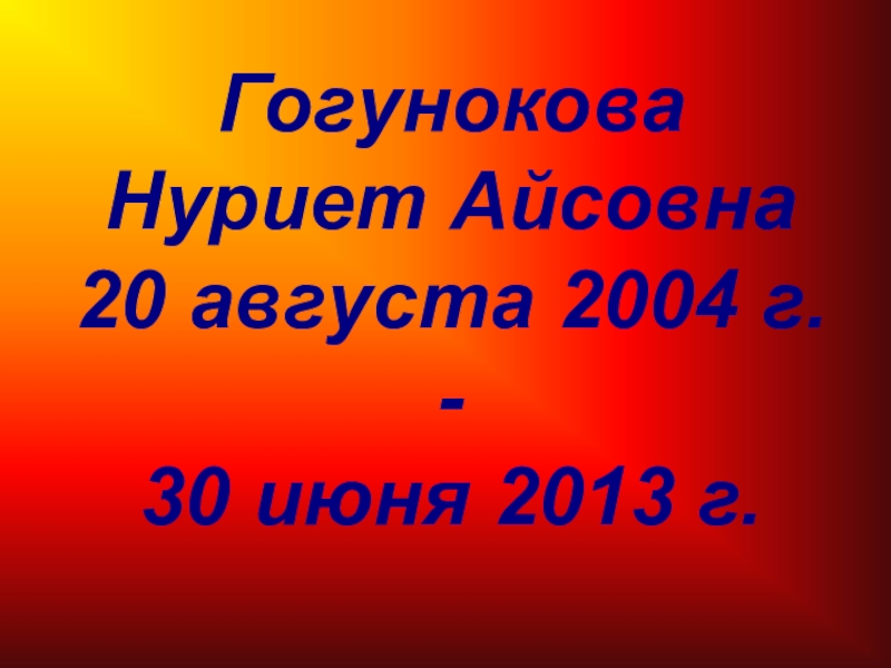 Слайд 18 Гогунокова Нуриет Айсовна 20 августа 2004 г. - 30 июня 2013 г.