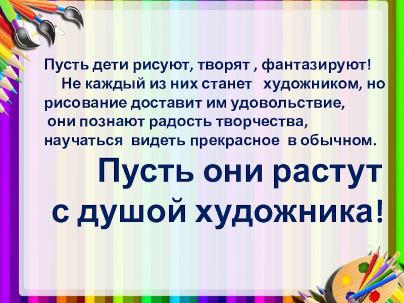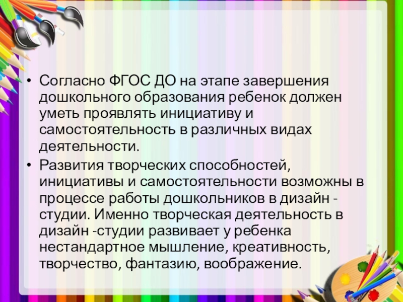 1. Создание условий для развития изобразительной деятельности (методическое и материально- техническое обеспечение, создание предметно – развивающей среды).
