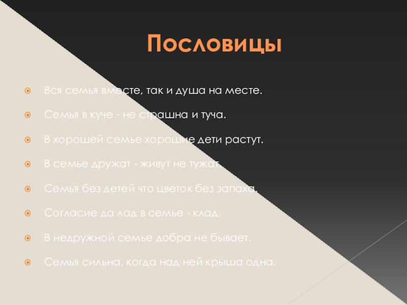 ПословицыВся семья вместе, так и душа на месте.Семья в куче - не страшна и туча.В хорошей семье