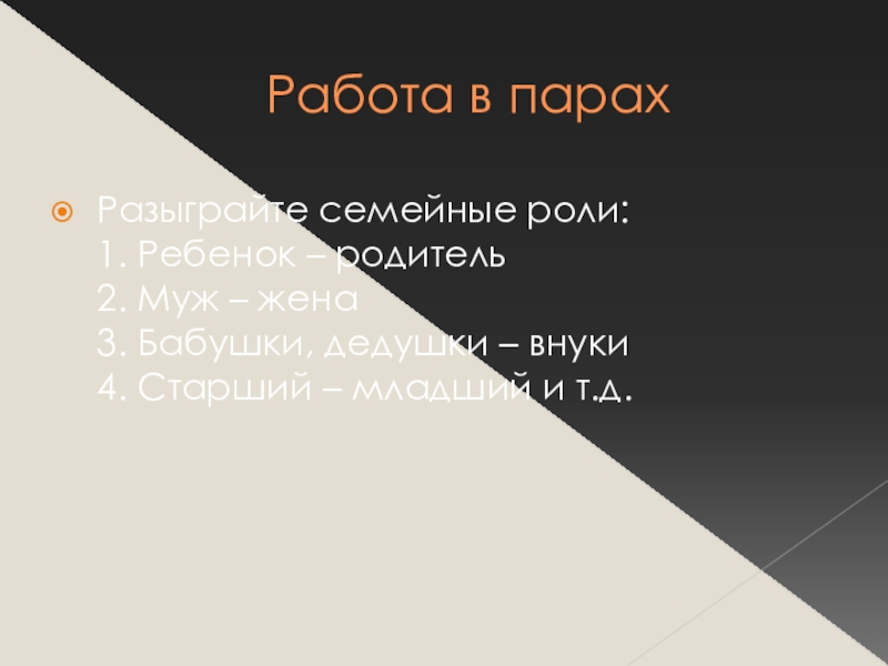 Работа в парахРазыграйте семейные роли:  1. Ребенок – родитель 2. Муж – жена  3. Бабушки,