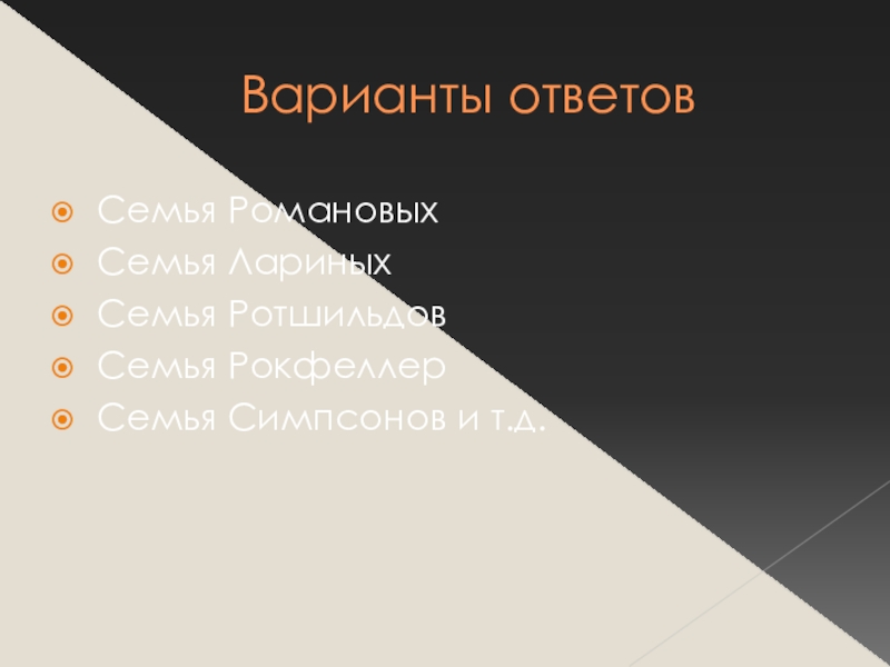 Варианты ответовСемья РомановыхСемья ЛариныхСемья РотшильдовСемья РокфеллерСемья Симпсонов и т.д.