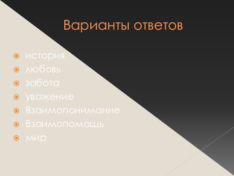 Варианты ответовисториялюбовьзаботауважениеВзаимопониманиеВзаимопомощьмир