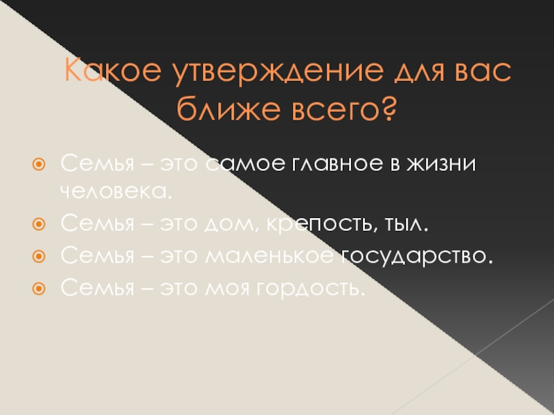 Какое утверждение для вас ближе всего?Семья – это самое главное в жизни человека.Семья – это дом, крепость,