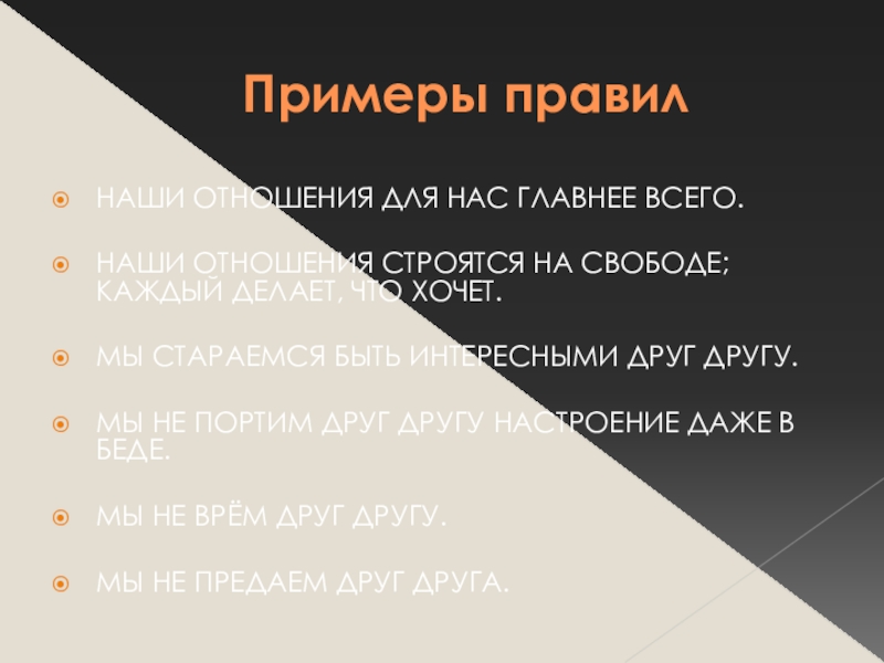 Примеры правилНАШИ ОТНОШЕНИЯ ДЛЯ НАС ГЛАВНЕЕ ВСЕГО.НАШИ ОТНОШЕНИЯ СТРОЯТСЯ НА СВОБОДЕ; КАЖДЫЙ ДЕЛАЕТ, ЧТО ХОЧЕТ.МЫ СТАРАЕМСЯ БЫТЬ