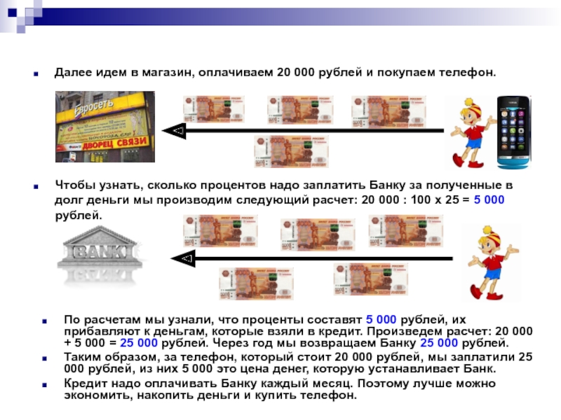 Чтобы узнать, сколько процентов надо заплатить Банку за полученные в долг деньги мы производим следующий расчет: 20 000 : 100 х 25 = 5 000 рублей.