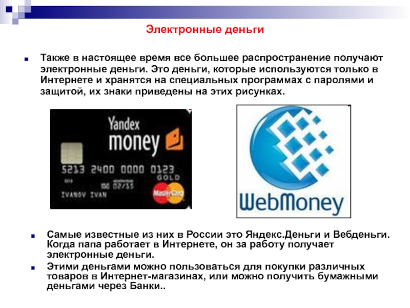 Самые известные из них в России это Яндекс.Деньги и Вебденьги. Когда папа работает в Интернете, он за работу получает электронные деньги.